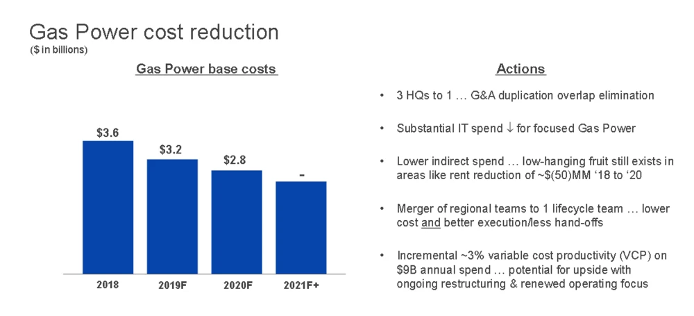 Die Kraftwerksparte soll nach Aussage des Managements deutlich verkleinert und so Kosten in Milliardenhöhe eingespart werden. Allein im Problembereich Gas Power sollen durch Mieteinsparungen und Umstrukturierungen 800 Millionen Dollar eingespart werden. Nach der Übernahme von Alstom durch GE war der Bereich Power aufgebläht und litt unter Überkapazitäten im Markt. 2018 erwirtschaftete die Sparte Power bei einem Umsatz von 27 Milliarden Dollar einen Verlust von 800 Millionen Dollar. Zum Vergleich: Siemens Power and Gas erlöste 2018 mit einem Umsatz von 12,4 Milliarden Euro immerhin ein Ergebnis von 377 Millionen Euro.