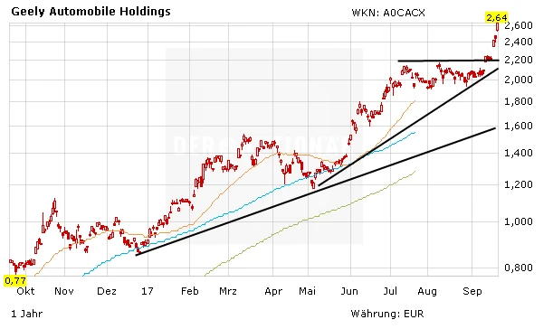 Auch Geely wird von der Hoffnung auf ein baldiges Ende der Verbrennungsmotoren auf China Straßen beflügelt. Zwar ist der Kursanstieg in den letzten Tagen im Vergleich zu BYD nicht ganz so atemberaubend, dennoch kletterte das Papier mit 2,60 Euro auf ein neues Allzeithoch. Geely verkaufte von seinem rein elektrisch betriebenen Emgrand EV 2016 zwar nur rund 17 000 Stück. Die Ziele sind aber ehrgeizig: in drei Jahren will Geely zu 90 Prozent Elektro- und Hybridfahrzeuge anbieten.