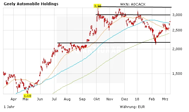 Nachdem die Geely-Aktie nach dem Daimler-Einstieg einige Tage nahezu gar nicht reagiert hat, scheint sich nach und nach durchzusetzen, dass der Deal für Geely sehr attraktiv sein könnte. Voraussetzung dafür ist allerdings auch ein Entgegenkommen von Daimler-Chef Dieter Zetsche. Die Geely-Aktie jedenfalls ist von 2,50 Euro bis auf 2,71 Euro geklettert. Bis zur psychologisch wichtigen Marke von 3,00 Euro ist der Weg frei. Im Anschluss wartet das Allzeithoch bei 3,26 Euro. Anleger geben kein Stück aus der Hand.