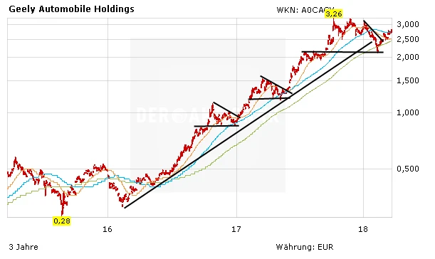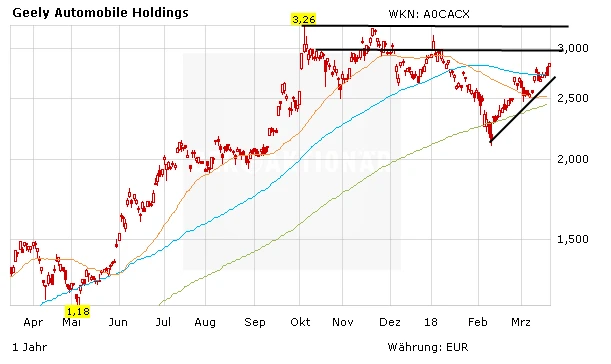 Die Aktie von Geely hat in den letzten Tagen mit der 90-Tage und der 38-Tage-Linie weitere Widerstände aus dem Weg geräumt. Nächstes Ziel ist die Marke von 3,00 Euro. Weitaus mehr Potenzial trauen dem chinesischen Autobauer die Analysten zu. Montag und Dienstag gab es gleich drei neue Kaufempfehlungen. Fubon Securities sieht für die Papiere ein Potenzial bis umgerechnet 4,13 Euro. Wei Sim von der HSBC hält 3,26 Euro für machbar und Yuanta-Securieties-Analyst Kevin Yim traut der Geely-Aktie 4,18 Euro zu.