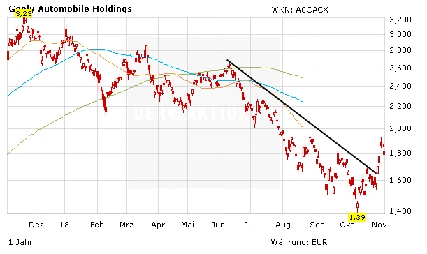 Angetrieben von einem möglichen Ende des Handelsstreits zwischen China und den USA sendet die Aktie von Geely endlich wieder Lebenszeichen. In den letzten Tagen ist das Papier von 1,55 Euro auf 1,80 Euro geklettert. Unterstützung gab es unter anderem von mehreren Analysten.