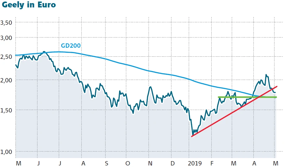 Die Aktie des Autobauers musste in den letzten Tagen ordentlich Federn lassen. Vom Zwischenhoch bei 2,17 Euro ging es zuletzt bis auf 1,77 Euro nach unten. Nach der fulminanten Rallye seit Anfang Januar musste die Aktie etwas Dampf ablassen. Der Aufwärtstrend wurde gebrochen. Kurzfristig orientierte Anleger sollten eine Bodenbildung abwarten. Die nächste Unterstützung wartet bei 15,21 HK (umgerechnet 1,73 Euro). Langfristig bleibt die Geely-Aktie eine der spannendsten Autowerte.