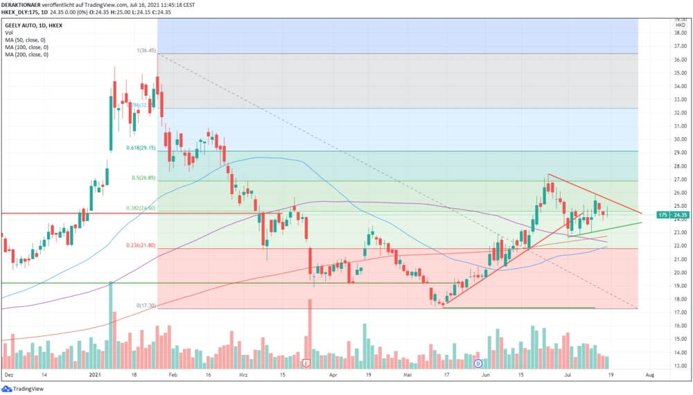 Seit Mitte Mai hat die Geely-Aktie eine starke Erholung hingelegt. Gleich mehrere wichtige Widerstände wie die 50-Tage-Linie bei 20 Hongkong-Dollar (HKD) oder das April-Hoch bei 23,50 HKD konnten überwunden werden. Am 50%-Fibonacci-Retracement bei 29,15 HKD war Ende Juni jedoch Schluss. Der Wert prallte an dieser Marke ab und fiel Anfang Juli schließlich unter die kurzfristige Aufwärtstrendlinie bei 23,70 HKD.