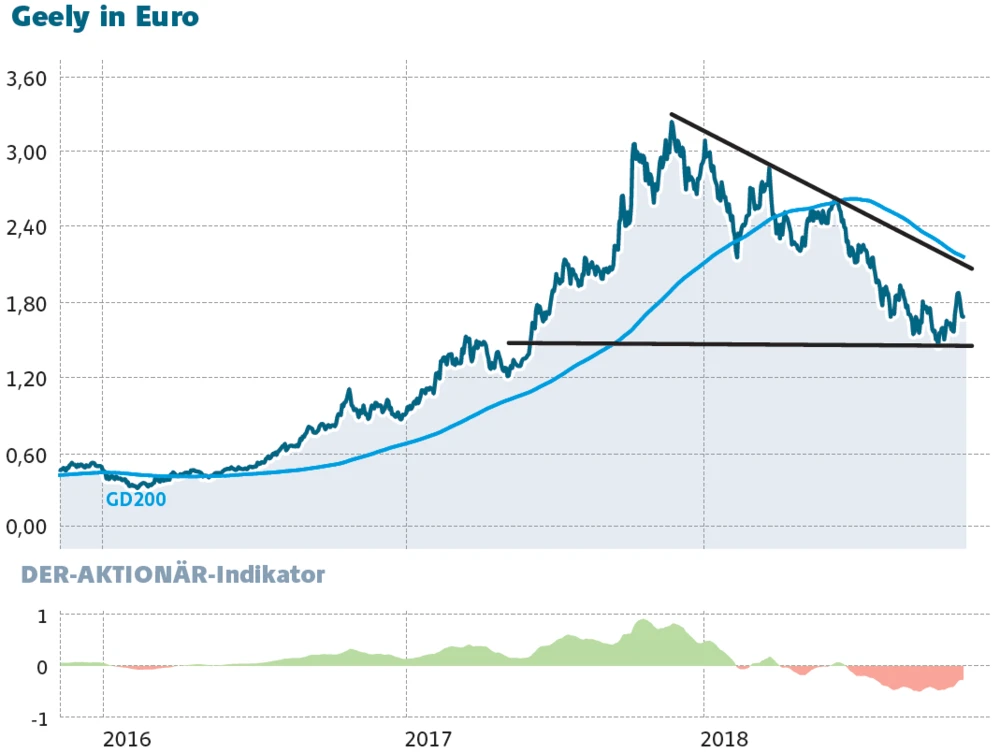 Dennoch scheint sich die Aktie nach dem langen Abwärtstrend wieder etwas aufzurappeln. Nach der Bewegung von 1,55 Euro bis 1,80 Euro ist ein Rücksetzer bis auf die Ausbruchslinie wahrscheinlich. Im Anschluss gilt es die wichtige 200-Tage-Line bei 20,41 Hong-Kong-Dollar oder umgerechnet 2,15 Euro nachhaltig zu überwinden. Noch kann man für die Aktie keine Entwarnung geben. Das langfristige positive Investment-Szenario bezüglich der Geely-Aktie bleibt aber intakt.
