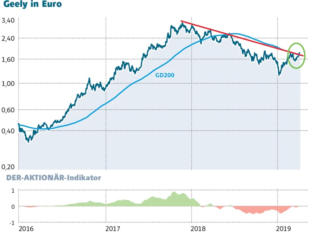 Die Geely-Aktie hat nach langer Durststrecke endlich den Sprung über die wichtige 200-Tage-Linie geschafft. Damit hat das Papier seit dem Tief Anfang Januar von 1,20 Euro auf 1,79 Euro zugelegt. Ein Plus von 49 Prozent. Langfristig bleibt Geely einer der interessantesten Plays im Autosektor.