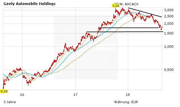 Die Geely-Aktie traf bei umgerechnet 1,75 Euro auf eine Unterstützung. Die Aussichten bleiben intakt. Geely ist hervorragend positioniert, der Technologie-Transfer der Marken aus der Holding wie Volvo, Lotus oder The London Taxi funktioniert. Mit Lynk & Co wurde eine neue Marke vor rund sechs Monaten erfolgreich am Markt positioniert. Die Aktie ist auf dem aktuellen Niveau zu günstig. Gibt es Entwarnung im Handelsstreit zwischen den USA und China, wird die Geely-Aktie schnell wieder Boden gut machen.