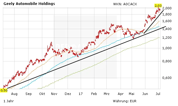 Gut für die Aktie von Geely: Ganz nebenbei bemerkt läuft das Stammgeschäft von Geely wie am Schnürchen. Eine Millionen Autos sollen 2017 verkauft werden. Das würde einem Plus von rund 31 Prozent entsprechen. Aktuell arbeitet man am Aufbau zweier neuer Plattformen. Auf einer werden in Zukunft Elektroflitzer, auf der anderen Hybridautos gebaut.