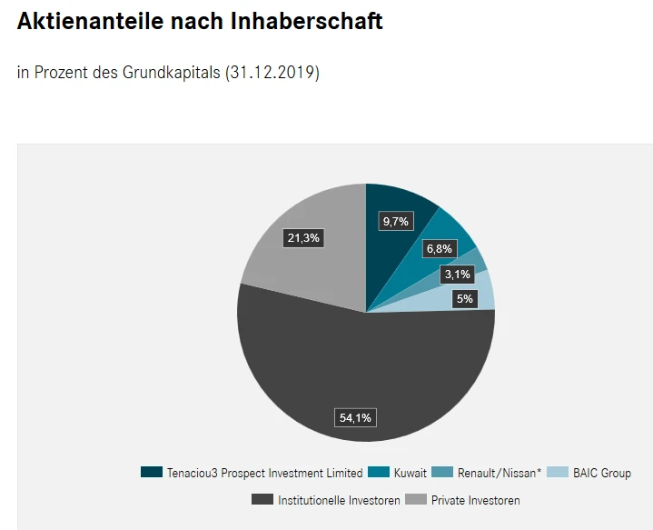 DER AKTIONÄR spekuliert schon länger darauf, dass Großaktionär Geely die Gunst der Stunde nutzen könnte, im schwachen Marktumfeld weitere Daimler-Aktien einzusammeln. Derzeit hält der chinesische Ankeraktionär über die Tenaciou3 Prospect Investment Limited 9,7 Prozent der Anteile. "Die Zukunft ist China. Alle die es schaffen, sich mit chinesischen Partnern stabil aufzustellen, sind die potentiellen Gewinner", sagt Auto-Experte Ferdinand Dudenhöffer von der Universität St. Gallen gegenüber dem AKTIONÄR.