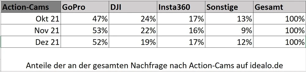 Wie Europas große Vergleichsplattform idealo.de im Vorfeld der Zahlen gegenüber dem AKTIONÄR Hot Stock Report durchblicken ließ (siehe Tabelle) ist es GoPro jedoch gelungen, hierzulande zwischen Oktober und Dezember die Marktanteile wieder zu steigern, während DJI hier an Boden verloren hat. Dies war eine gute Indikation für die jetzt vorgelegten GoPro-Ergebnisse, die positiv überraschen konnten.