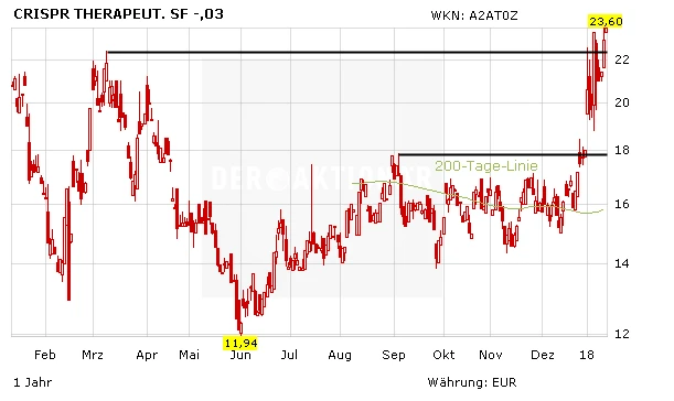 Eine Kapitalerhöhung zu 22,75 Dollar und der umstrittene Report – beide Ereignisse konnten die Rallye bei CRISPR Therapeutics bislang nicht stoppen. Doch nach 50 Prozent in einem Monat ist die Aktie reif für eine Korrektur. Investierte Anleger sollten das Kursniveau nutzen, um Teilgewinne zu realisieren und auf einem günstigeren Kursniveau wieder zum Zuge zu kommen. Mit einem Stopp bei 17,00 Euro sollte die restlichen CRISPR-Aktien abgesichert werden. Denn die Papiere bleiben hochspekulativ.