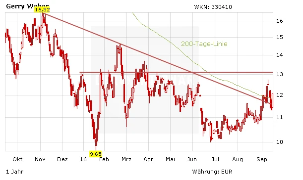 Das charttechnische Bild hat sich auf Jahressicht leicht aufgehellt. Die Aktien von Gerry Weber haben sowohl den mittelfristigen Abwärtstrend als auch die 200-Tage-Linie nach oben durchbrochen. Die Papiere könnten weiter nach oben laufen, wenn auch noch der Widerstand bei 13,10 Euro nachhaltig rausgenommen wird. Wer mutig ist, steigt dann ein und spekuliert auf ein Comeback. Stopp bei 9,00 Euro setzen.