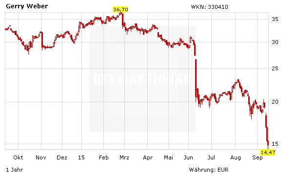 Die schwache Entwicklung bei Gerry Weber spiegelt sich auch auf dem Kurszettel wider: Mit einem Minus von fast 50 Prozent seit Jahresanfang zeigt das Papier das bislang schwächste Performance unter den 50 MDAX-Werten. Der deutlich gesunkene Börsenwert hat Folgen: Am 21. September fliegt die Aktie aus dem MDAX und wird künftig eine Index-Etage tiefer im SDAX notiert sein.