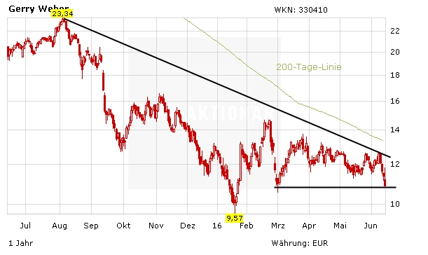 Kurz nach Bekanntgabe der Zahlen notierte die Aktie von Gerry Weber mit fast drei Prozent im grünen Bereich – drehte aber kurz darauf wieder ins Minus. Insgesamt haben die Papiere seit März 2014 über 70 Prozent eingebüßt. Nur wer mutig ist, steigt jetzt ein und spekuliert auf ein Comeback. Stopp bei 9,00 Euro setzen.
