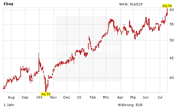 Erst zu Wochenbeginn hat die Ebay-Aktie ein neues Allzeithoch markiert. Im vorbörslichen US-Handel ist der Titel am Donnerstag trotz Gewinnrückgang weiter nach oben geklettert. Investierte Anleger bleiben dabei. Neueinsteiger können auch weiterhin zugreifen – sowohl bei der Aktie, als auch dei dem in Ausgabe 13/15 empfohlene Knock-out (WKN: VZ63V5).