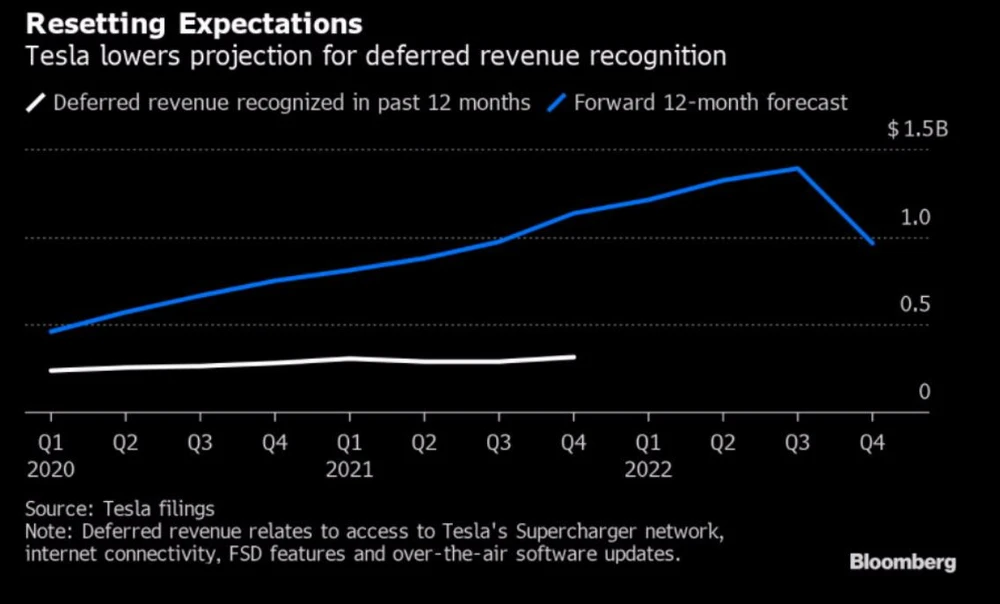 Ins Auto legen, Augen schließen und entspannt zur Arbeit gefahren werden – solche Träume haben viele Autofahrer, doch die Hersteller bleiben bislang hinter ihren Versprechen zurück. Nun schreibt Bloomberg, dass Tesla die Erwartung der durch Selbstfahr-Funktionen realisierten Umsätze zurücknimmt – siehe Grafik.