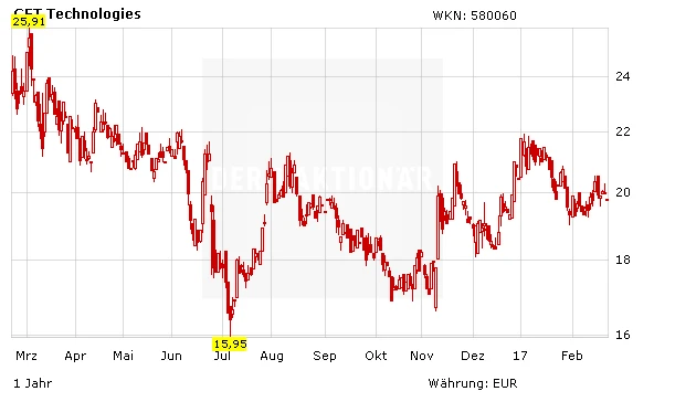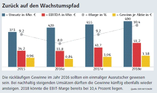 Die 9-Monats-Zahlen haben gezeigt, dass die Sorgen der Investoren überzogen waren. „GFT ist sehr tief in der Banken-IT verwoben. In diesem Maschinenraum haben Banken kaum Möglichkeiten, Kosten zu reduzieren. Bei aufkommender Unsicherheit wie durch den Brexit wird jedoch bei zukunftsorientierten Themen schon mal das ein oder andere Projekt geschoben, was die Mitarbeiterauslastung im Jahr 2016 belastet hat“, sagt Warburg-Experte Wolf. Dennoch dürften die Umsätze im abgelaufenen Jahr um rund zwölf Prozent auf 420 Millionen Euro gestiegen sein. Unterm Strich wird dagegen ein Rückgang von über zwölf Prozent auf 0,84 Euro je Aktie zu Buche stehen. Über die genaue Entwicklung wird GFT am 2. März berichten. Im laufenden Jahr sollte diese temporäre Delle aber wieder überwunden werden und ein überproportionales Ergebniswachstum erzielt werden.