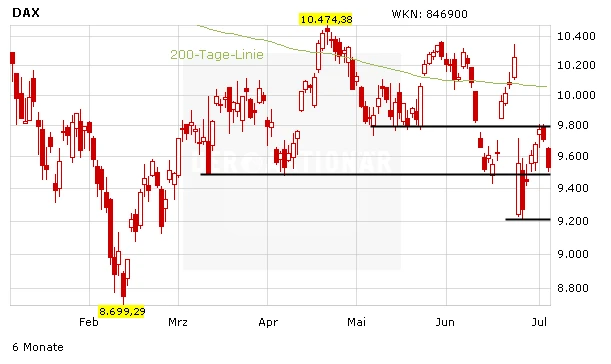 Wird die Unterstützung bei 9.500 nachhaltig unterschritten, wartet die nächste Auffanglinie im Bereich von 9.314/9.338 Punkten. Die dürfte aber dann nur eine Zwischenstation auf dem Weg zu den Tiefs nach dem britischen EU-Referendum sein. Hier entscheidet sich dann, ob die Bullen noch einmal die Kraft haben, sich gegen den Abwärtstrend zu wehren, oder ob es unter die 9.000 gehen wird. Ein charttechnischer Befreiungsschlag in Form eines Überwindens der 200-Tage-Linie rückt in immer weitere Ferne.