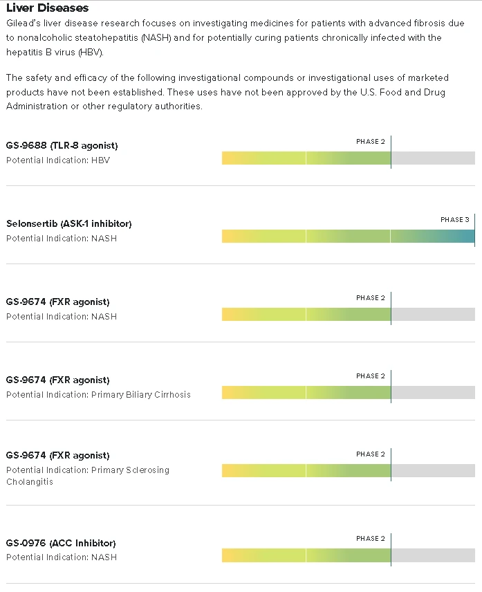 Gilead verfügt über verschiedene Produktionskandidaten – Selonsertib ist der größte Hoffnungsträger, der sich aktuell in der Phase 3 der Entwicklung befindet. Die Pipeline mit Wirkstoffen gegen Lebererkrankungen: