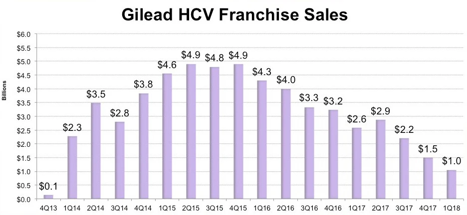 Die Biotech-Gesellschaft Gilead hat gestern mit den Zahlen zum ersten Quartal 2018 erneut für dicke Sorgenfalten gesorgt. Sowohl der Umsatz als auch das Ergebnis je Aktie lag im Berichtszeitraum unter den Schätzungen der Analysten. Derweil schrumpft das Geschäft mit Hepatitis-C-Medikamenten noch stärker als erwartet. Doch es gibt auch einen, wenn gleich auch kleinen Lichtblick im Zahlenwerk von Gilead.
