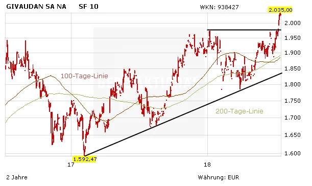 Die Übernahme berücksichtigt fortan der UBS-Analyst Andrew Stott in seinem Bewertungsmodell für die Papiere von Givaudan. Analyst Stott passte sein Kursziel von 2.250 auf 2.300 Schweizer Franken an, sein Votum lautet unverändert „Neutral“. Angesichts der Perspektiven in einem stetig wachsenden Markt für Duft- und Aromastoffe und der marktführenden Stellung Givaudans sind die Papiere mit einem Kurs-Gewinn-Verhältnis von 25 für 2019 kein Schnäppchen. Im Vergleich zum deutschen Pendant Symrise hingegen (2019er-KGV von 30) hat die Aktie durchaus noch Luft nach oben.
