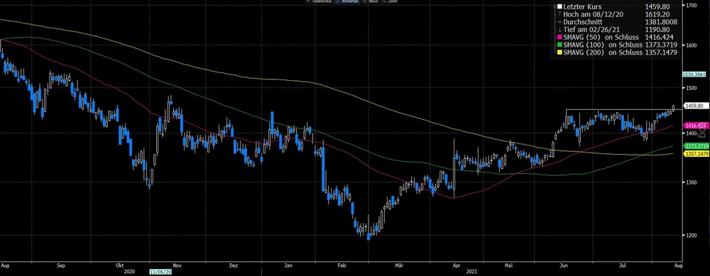 Mit einem Kurs von 1.462 Britische Pence hat die Aktie von GlaxoSmithKline den höchsten Stand des Jahres erklommen. Charttechnisch konnte mit dem Kurssprung eine wichtige Widerstandszone überwunden werden (siehe Chart).