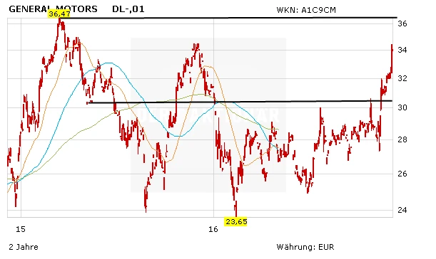 Die Aktie von GM sieht technisch etwas besser aus als die des Konkurrenten Ford. Ganz ohne Zweifel schlägt GM in Sachen Performance auch die deutschen Autobauer Daimler, BMW und VW. Man muss nicht unbedingt Fan der Autos von GM sein. Aber, warum nicht als Depotbeimischung eine kleine Position in GM wagen?