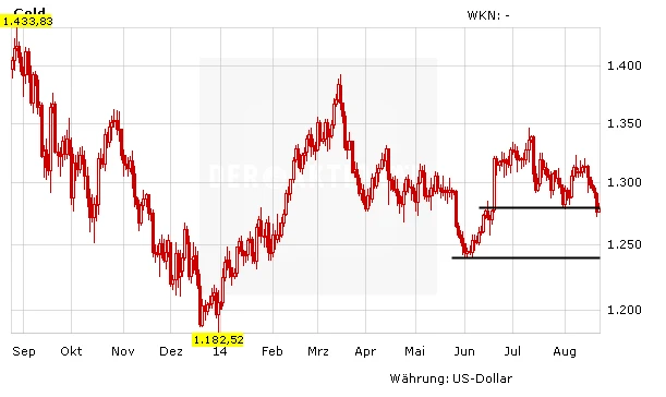 Sah es noch Mitte Juli so aus, als könnte dem Goldpreis endlich der Ausbruch nach oben gelingen, so musste das Edelmetall in den vergangenen Wochen wieder einen Rückschlag einstecken. Dabei rutschte der Goldpreis zuletzt sogar unter die 200-Tage-Linie und auch unter den Support bei 1.280 Dollar. Für Druck sorgte in der vergangenen Woche unter anderem die Sitzung der amerikanischen Notenbank. Dem Protokoll zufolge halten viele Ratsmitglieder eine frühere Zinserhöhung für angemessen. Aus charttechnischer Sicht ist es nun wichtig, die genannten Unterstützungen schnell zurückzuerobern. Andernfalls wäre ein Test des Juni-Zwischentiefs bei 1.240 Dollar sehr wahrscheinlich.