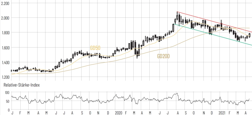 Doch was hält Gold dann eigentlich noch zurück? Die Antwort ist einfach. Die Technik. Gold ist in diesem Korrekturtrend ist in diesem Korrekturtrend seit mittlerweile acht Monaten gefangen. Und das ist nicht gerade dazu angetan, frisches Kapital anzulocken. Doch wenn man sich die Korrektur auf Wochenbasis ansieht, dann erkennt man: Die komplette Bewegung verläuft in einer bullishen Flagge. Und Gold nähert sich gerade wieder dem oberen Ende dieser Korrekturformation. Ein Ausbruch über den Bereich von 1.810 Dollar auf Wochenschlussbasis, wäre ein starkes Indiz, dass die Korrektur beendet ist und Gold und vor allem die Goldminenaktien bereit sind für die nächste Rallyephase. Und angesichts der Länge der Korrektur und des fast idealen fundamentalen Umfelds, dürfte die nächste Rallye entsprechend explosiv ausfallen.