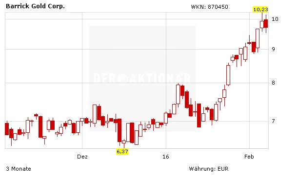 Nach dem furiosen Start in das Jahr 2016 dürfte Gold und auch die Goldminenaktien in den kommenden Tagen einen Gang zurückschalten. Dieses Tempo lässt sich nicht durchhalten, sonst würde Barrick bis zum Jahresende 500 Prozent im Plus notieren. Und das wiederum, bei aller Euphorie, traue ich Barrick dann doch nicht zu. Allerdings sind solche Gewinne, auch wenn es heute noch keiner glauben will, bei kleineren Minengesellschaften durchaus möglich.