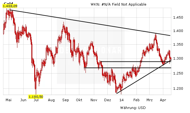 Es ist erstaunlich, dass die Bullen in diesem Umfeld keinerlei Gegenwehr zeigen und alle Hoffnungen auf eine Gegenbewegung sich bislang zerschlagen haben. Fällt die Unterstützungszone zwischen 1.260 und 1.280 Dollar, dann ist ein Test der Tiefs bei 1.180 Dollar aus dem vergangenen Jahr wahrscheinlich. Nur warum dieses Szenario eintreten soll, das ist ein Rätsel. Diejenigen, die einen Preisrutsch vorhergesagt haben, könnten also Recht behalten – auch wenn die Argumente wenig stichhaltig sind.