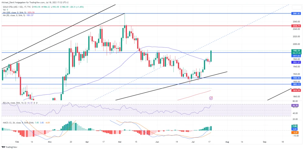 Schafft es das Edelmetall den Tag über dieser Widerstandszone zu beenden, ist das ein starkes Kaufsignal. Dieses sollte weitere Marktteilnehmer anlocken und den Goldpreis schon bald über die 2.000-Dollar-Marke bewegen. Anschließend ist sogar der Weg in Richtung des Allzeithochs bei 2.081,82 Dollar frei.