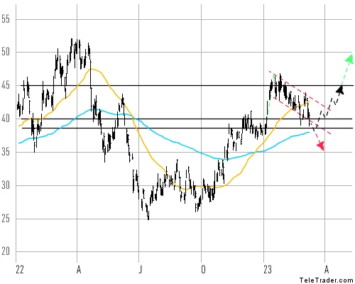 Ähnlich wie in den Kursen von Gold und Kupfer, mit denen Freeport-McMoRan kaum überraschend hoch korreliert ist, liegen auch hier gemischte Signale vor. Innerhalb des im Herbst letzten Jahres gestarteten Aufwärtstrends hat sich ein kurzfristiger Abwärtstrend gebildet. Für Kurse innerhalb der Flagge ist das Konsolidierungsmuster jedoch bullish. Dieses droht die Aktie mit dem schwachen Handelsschluss gestern allerdings aufzugeben. Gefragt ist vor dem Wochenende daher die Supportzone zwischen 38 und 40 Dollar. Zumindest auf Stundenbasis muss außerdem ein Aufsetzen auf der 200-Tage-Linie bei 37,89 Dollar eingeplant werden.