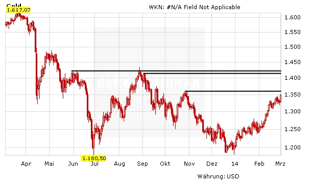 Noch Ende der vergangenen Woche sah alles nach einer Konsolidierung beim Goldpreis aus – zwar spitzte sich bereits am Freitag die Situation in der Ukraine zu. Doch es schien noch niemanden wirklich zu interessieren. 1.309 Dollar beziehungsweise 1.280 Dollar wurden als Zwischenziele herumgereicht. Doch was passierte? Der Goldpreis setzte seinen Aufwärtstrend, den er seit Beginn des Jahres inne hat, weiter fort. Und plötzlich rückt nicht mehr die 200-Tage-Linie in den Mittelpunkt, sondern der Widerstand bei 1.360 Dollar. Sollte dieser tatsächlich genommen werden, wäre der Widerstandsbereich bei 1.420 bis 1.430 Dollar nicht mehr fern – und dann würden die Bullen vermutlich wirklich versuchen, die große Widerstandszone bei 1.500 Dollar in Angriff zu nehmen. Der einstige Betonboden für Gold, der beim Mini-Crash im April vergangenen Jahres durchstoßen wurde, wird wohl die endgültige Richtung weisen.