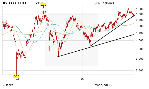 BYD ist eine der spannendsten Wetten auf den Ausbau der Elektromobilität Hierzulande noch ziemlich unbekannt, sorgte die Firma in China für Furore. BYD baut Elektroautos und Busse. Bei der Herstellung von Batterien ist BYD hinter Panasonic auf Platz 2. Aktuell konsolidiert die Aktie. Die untere Begrenzung des Aufwärtstrends verläuft bei 5,83 Euro Euro, die 90-Tage-Linie bei 5,75 Euro. Stärkere Rücksetzer bleiben Kaufchancen!
