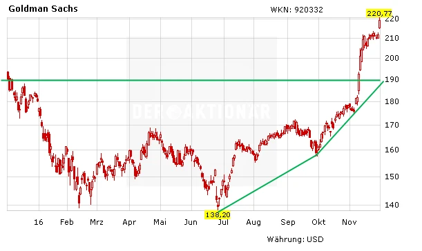 Die jüngste Rallye bei Goldman Sachs dürfte mit Mnuchin als geplantem Finanzminister weitergehen. Er kann an oberster Stelle Einfluss auf wichtige Entscheidungen nehmen und so Hindernisse für die Bank aus dem Weg räumen. Fundamental ist die Aktie mit einem erwarteten KGV von 12 für 2017 aufgrund der Wachstumsaussichten nicht zu teuer. Auch das Kurs-Buchwert-Verhältnis ist mit 1,3 nicht zu teuer. Anleger können bei Goldman Sachs noch zugreifen, das Ziel beträgt unverändert 250,00 Euro, der Stopp wird auf 160 Euro nachgezogen