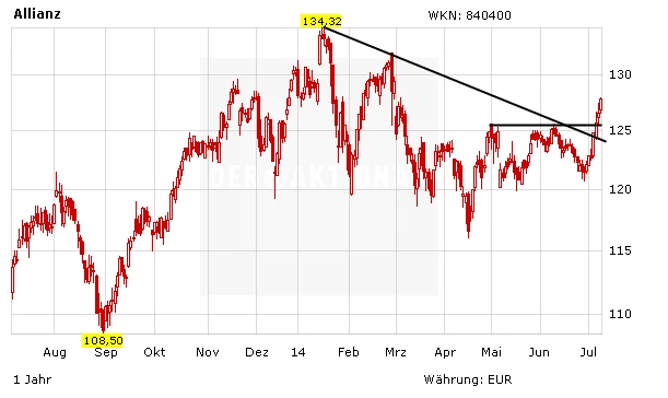 Die nach wie vor günstig bewertete Aktie der Allianz bleibt weiterhin attraktiv. Durch den jüngsten Kurssprung ist der Ausbruch aus dem seit Jahresbeginn intakten Abwärtstrend geglückt, wodurch sich das Chartbild wieder etwas aufgehellt hat. Anleger, die sich die DAX-Titel in ihr Depot gelegt haben, sollten den Stoppkurs bei 115,00 Euro setzen.