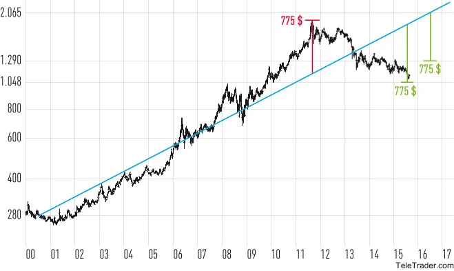 Zum anderen ist der Goldpreis derzeit ohnehin deutlich zu günstig, betrachtet man einmal die Geldmengen-Entwicklung im Vergleich zum Goldpreis. 280 Dollar haben die Anleger im Jahr 2000 durchschnittlich über den Banktresen geschoben, um 31,1 Gramm Gold zu bekommen. Ronald-Peter Stöfele, Goldanalyst der Erste Group, erklärt, seither sei die kombinierte Basis-Geldmenge der vier wichtigsten Notenbanken um jährlich 15 Prozent erhöht worden. Die Menge des bereits aus der Erde geholten Goldes legte dagegen nur um 1,5 Prozent pro anno zu. Ausgehend von diesen Daten hätte eine Unze Gold im Jahr 2011 durchschnittlich 1.105 Dollar kosten müssen; tatsächlich wurde sie in der Spitze für rund 1.880 Dollar gehandelt, also für 775 Dollar mehr. Im laufenden Jahr müsste Gold, wieder rein theoretisch und um alle anderen Einflüsse bereinigt, 1.823 Dollar je Feinunze kosten. Wenn die Differenz von theoretischem Preis und Spitzenpreis im Jahr 2011, also diese 775 Dollar nun nach unten abgetragen werden, endet dieses Maximal-Schwankungspendel bei 1.048 Dollar je Unze, also in etwa auf dem vor der jüngsten Erholung erreichten Niveau. Im nächsten Jahr sollte Gold theoretisch 2.065 Dollar je Unze kosten und mit dem Schwankungsausschlag von 775 Dollar mindestens 1.290 Dollar.