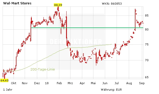 Der Einzelhandel-Gigant lässt sich nicht vom Platzhirsch Amazon beirren und gilt nach wie vor als Basisinvestment für jedes Depot. Mit einer Dividendenrendite von 2,1 Prozent und einem soliden Geschäftsmodell, das kontinuierlich optimiert wird, ist Walmart perfekt für langfristig orientierte Anleger geeignet. Der AKTIONÄR empfiehlt einen Stoppkurs bei 75 Euro.