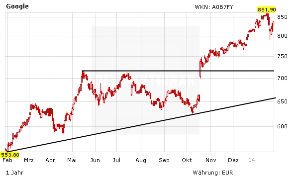 Zuletzt macht Google mit den Käufen von Nest, einem Anbieter digitaler Thermostate und Rauchmelder und von DeepMind, eine britische Firma die sich mit künstlicher Intelligenz beschäftigt, positiv auf sich aufmerksam. Auch die Nachricht über den Verkauf der Handysparte kommt an. Nachdem die Aktie bereits am Mittwoch nachbörslich zulegte, setzt sich der Positive Trend am Donnerstag zur US-Handelseröffnung fort. Die Aktie notiert in Schlagdistanz zum Jahreshoch. Google ist ein Top-Investment. Das 12-Monats-Kursziel des AKTIONÄR liegt bei 1.000 Euro.