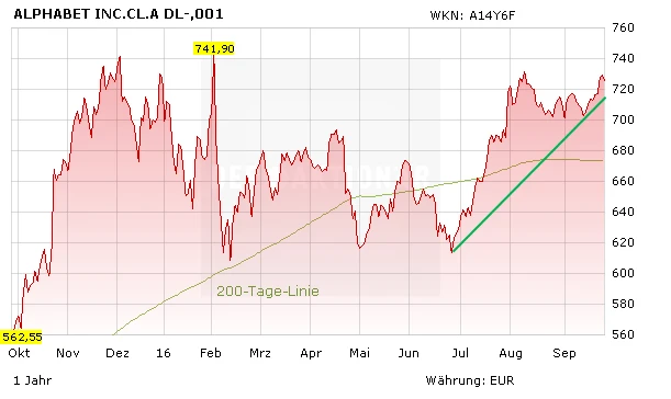 Die Aktie von Alphabet, Googles Mutterkozern, befindet sich in einem langfristigen Aufwärtstrend. Am Freitag kamen die Anteilsscheine leicht ins Straucheln, nachdem Gerüchte über eine Mögliche Übernahme Twitters durch Google die Runde machten. Seit Empfehlung in DER AKTIONÄR Ausgabe 4/16 haben ist die Aktie um über zehn Prozent zugelegt. Da ist definitiv noch mehr drin. Investierte Anleger bleiben dabei.