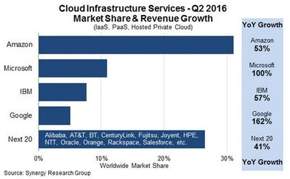 Google besitzt genügend Kapital und Rechenpower, um seinen Cloud-Dienst voranzubringen. Nach eigenen Angaben nutzen bereits mehr als eine Milliarde Nutzer Cloud-Services. Im Jahr 2020 will der IT-Gigant in der Cloud mehr Umsätze generieren als mit dem traditionellen Kerngeschäft der Werbung. Zur Relation: Im Jahr 2015 erzielte Google 67 Milliarden Dollar an Werbeeinnahmen. Die Umsätze der Cloud-Sparte weist Google bisher nicht explizit aus. Der Marktanteil wird von Synergy Research auf fünf Prozent geschätzt. Der Anteil von AWS liegt bei 31 Prozent.