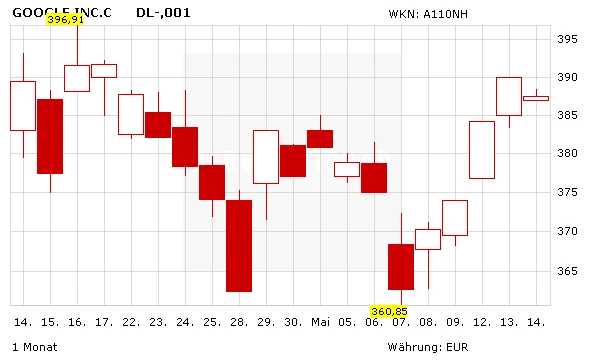 Nach dem Aktiensplitt bei Google notiert die "C" Aktie aktuell bei rund 387 Euro. Der Aufwärtstrend der letzten Tage sollte weiter anhalten. Auf der Oberseite liegt das nächste Ziel bei 396 Euro. Um das bullische Szenario nicht zu gefährden, sollte die Aktie nicht mehr unter 360 Euro fallen.
