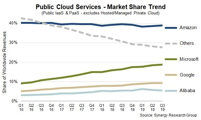 Klar ist jedoch, dass Google weiter Marktanteile gewinnt. Während Amazon laut Synergy Research in den vergangenen Quartalen bei einem Marktanteil von 40 Prozent lag, hat Google zugelegt und kommt nun auf knapp zehn Prozent.