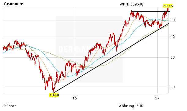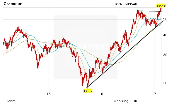 Grammer ist mit einem Kurs-Umsatz-Verhältnis von 0,5 nicht zu teuer. Das KGV beträgt für 2017 knapp 13. Es bleibt dabei: Kurse um 65 Euro plus X sind durchaus drin. Die Aktie sollte nach einer kurzen Verschnaufpause in den nächsten Tagen auf ein neues Allzeithoch klettern. Gut möglich, dass Hastor seine Anteile weiter aufstockt. Anleger geben kein Stück aus der Hand.