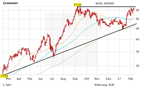 Grammer ist mit einem Kurs-Umsatz-Verhältnis von 0,5 ohnehin nicht teuer. Das KGV beträgt für 2017 knapp 13. Es bleibt dabei: Kurse um 65 Euro plus X sind durchaus drin. Die Aktie ist auf ein neues Hoch geklettert. Anleger geben kein Stück aus der Hand.