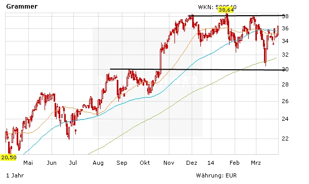 Die Aussicht auf eine Dividendenerhöhung nach dem Rekordjahr 2013 schiebt die Grammer-Aktie kräftig an. Neben der Dividendenerhöhung von zuletzt 0,50 Euro auf 0,65 Euro je Aktie kommen auch die Zahlen gut an. Die Nettofinanzverbindlichkeiten sowie die angekündigte Dividende seien besser als erwartet, so Analyst Klaus Breitenbach von der Baader Bank. Grammer äußerte sich zudem positiv zum Geschäftsausblick, wonach das Unternehmen seinen Umsatz im Vergleich zum Vorjahr spürbar auf über 1,3 Milliarden Euro steigern und das zuletzt hohe operative Ergebnis weiter stabil halten will. Weil der Konzern auch 2014 viel Geld in Vorleistung für künftige Produkte steckt, dürfte der operative Gewinn wie im Vorjahr bei rund 58 Millionen Euro liegen. Erst in der vergangenen Woche hatten Grammer-Papiere von Spekulationen profitiert, dass der US-Autozulieferer Lear Corp an dem Unternehmen
