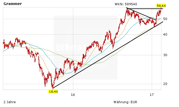 DER AKTIONÄR hält es für durchaus denkbar, dass für Grammer an einer Alternativlösung, einem Gegenpool zu Hastor gearbeitet wird. Nach Hastor hält der nächst größere Aktionär knapp 5,2 Prozent an Grammer. Der Streubesitz liegt bei 60,6 Prozent. Grammer ist mit einem Kurs-Umsatz-Verhältnis von 0,4 ohnehin nicht teuer. Das KGV beträgt für 2017 knapp elf. Kurse um 65 Euro plus X sind durchaus drin. Die Aktie ist auf ein neues Hoch geklettert. Anleger geben kein Stück aus der Hand.