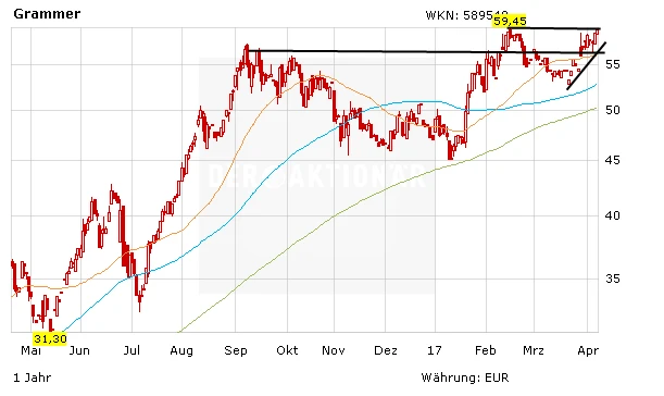 DER AKTIONÄR hält an seiner Einschätzung fest: Grammer ist mit einem Kurs-Umsatz-Verhältnis von 0,5 nicht zu teuer. Das KGV beträgt für 2017 knapp 13. Es bleibt dabei: Kurse um 65 Euro plus X sind durchaus drin. Gut möglich, dass Hastor seine Anteile weiter aufstockt. Anleger geben kein Stück aus der Hand.
