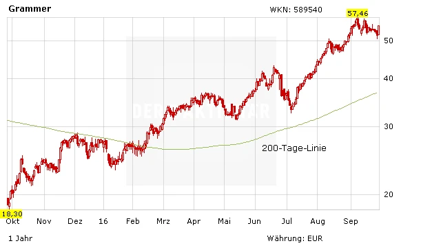 Seit Anfang des Jahres hat die Aktie ihren Wert fast verdoppelt. Nicht schlecht im Vergleich zum SDAX, der im gleichen Zeitraum ein Plus von knapp drei Prozent verzeichnete. Die gute Wertentwicklung hat mehrere Gründe. Zum einen hat sich im März 2016 die Familie Hastor (HALOG, Cascade) mit 10,2 Prozent bei Grammer eingekauft, zum anderen hat Grammer nicht nur gute Zahlen vorgelegt, sondern Mitte August sogar die Jahresprognose angehoben. Von wegen, den deutschen Autozulieferern gehe es schlecht und sie würden unter der Marktmacht von VV und Co ächzen.