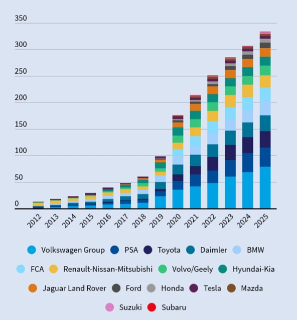 Und das Wachstum geht rasant weiter. Der European Federation for Transport and Environment (T&E) zufolge können Kunden im Jahr 2025 schon aus 333 verschiedenen Autos wählen. Zu diesem Zeitpunkt nimmt die Bedeutung von Hybrids weiter ab – 60 Prozent dieser Autos setzen dann vollständig auf Batterien.